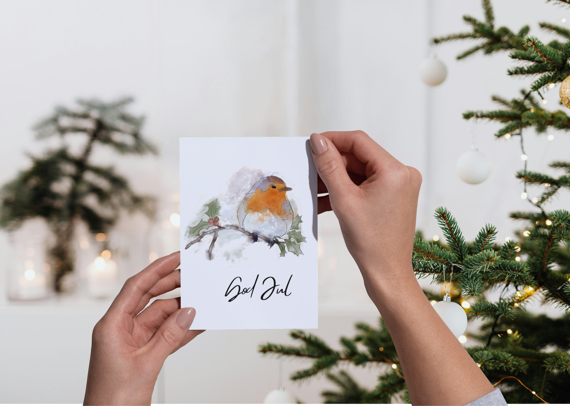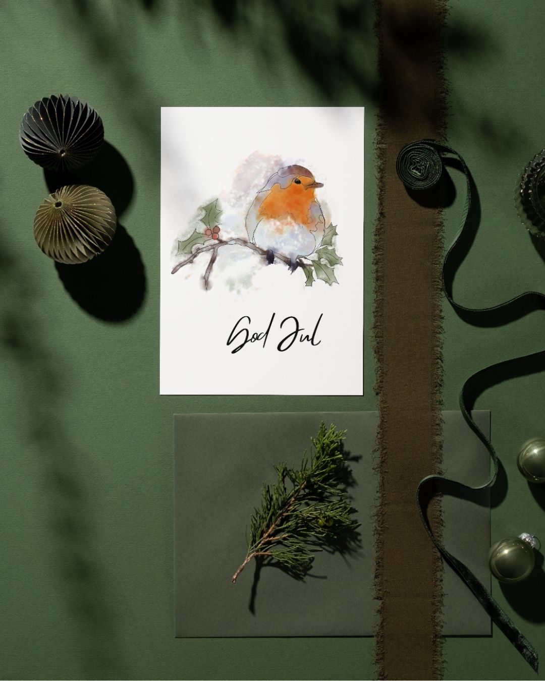 10 pakning med julekort med fuglemotiv. Det originale motivet ble tegnet digitalt og fargelagt med akvarell. En nydelig liten rødstrupe som kvitrer jule inn.
