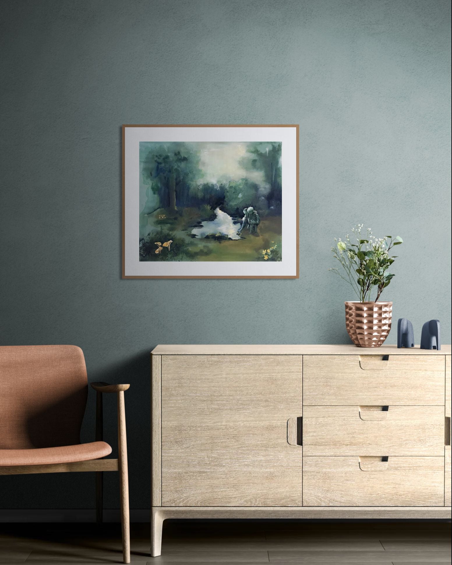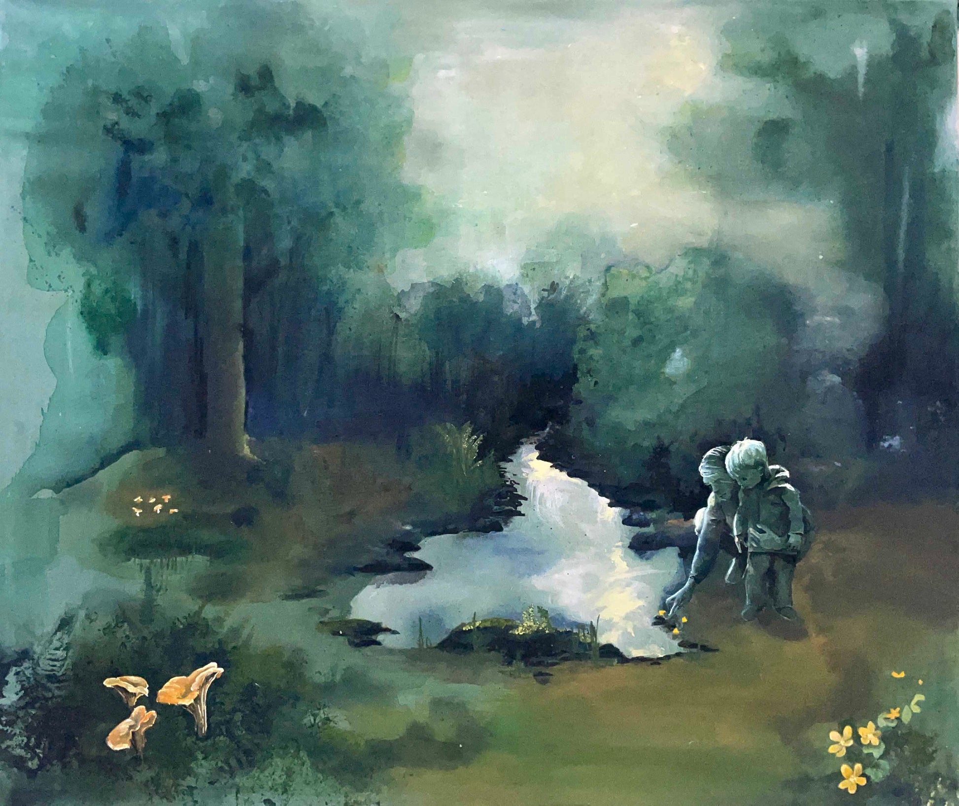 Å bøye seg helt ned, er en del av serien «Skogen vår», inspirert av mange av de fineste barndomsminnene har jeg fra turer i skogen med mamma. Da var det bare oss to. Det var hemmelige soppsteder som bare jeg fikk vite om. Det var tulleruskomsnusk-huler, historier om gjemte skatter, magisk lys og indianer-lek fra hennes egen barndom.