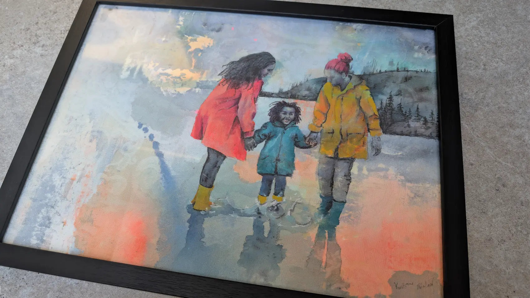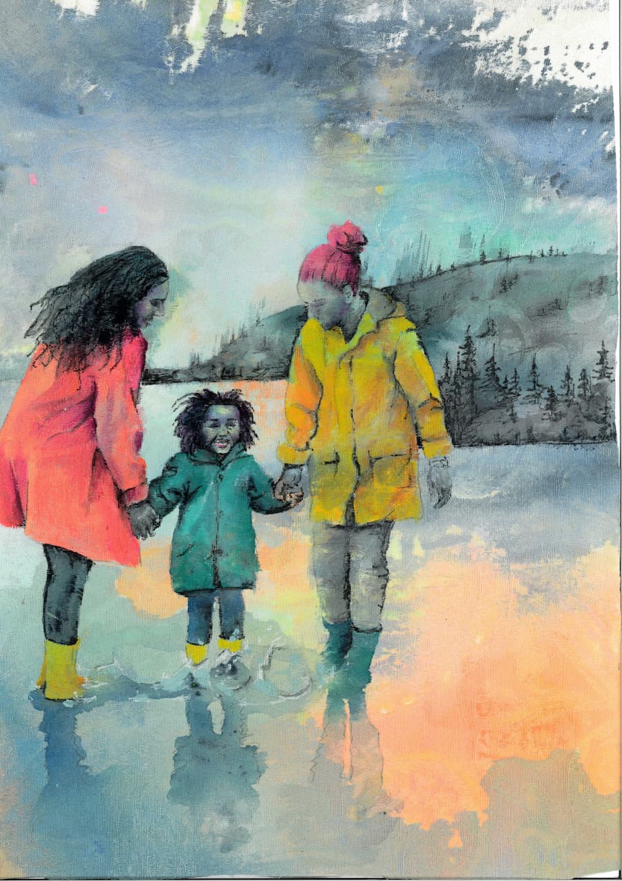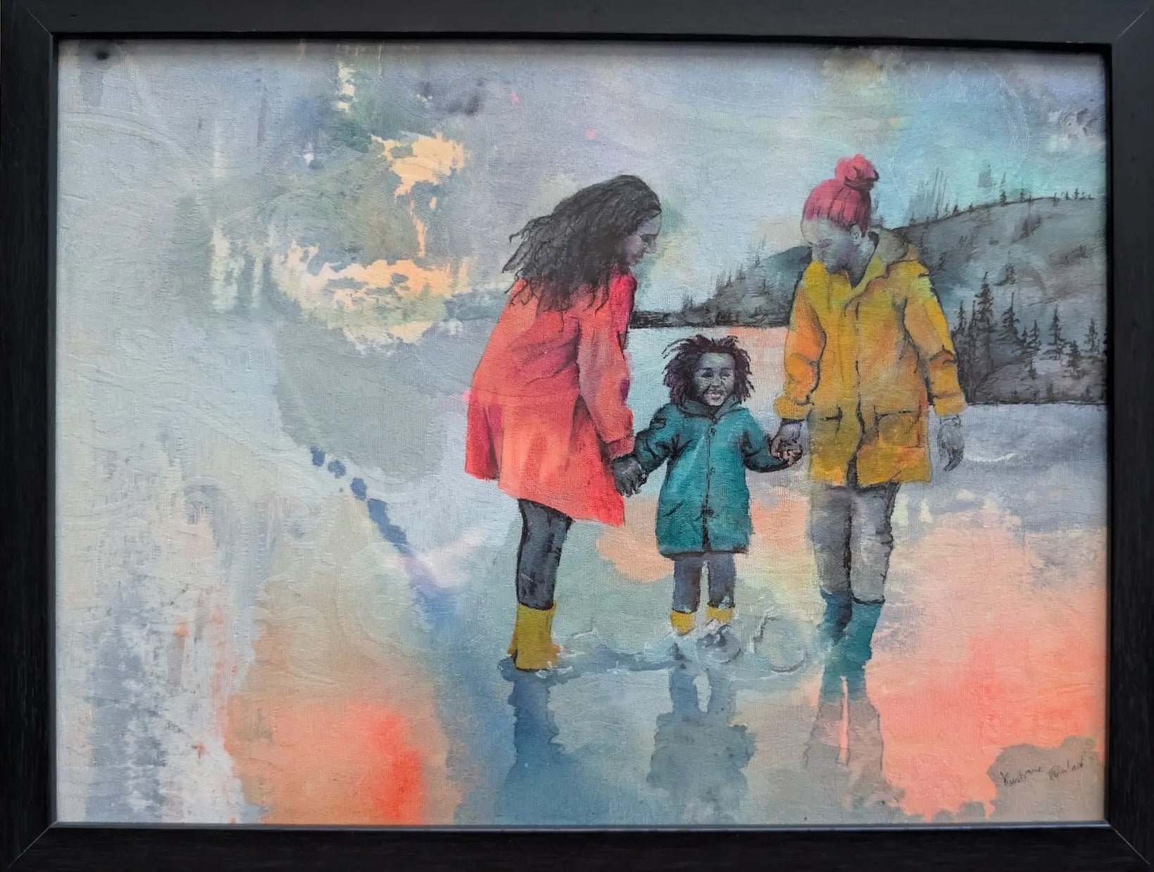 Farget av kjærlighet et et fargerikt maleri av en liten familie, malt til en Pride-utstilling for feiring av mangfold og kjærlighet.