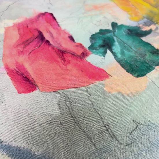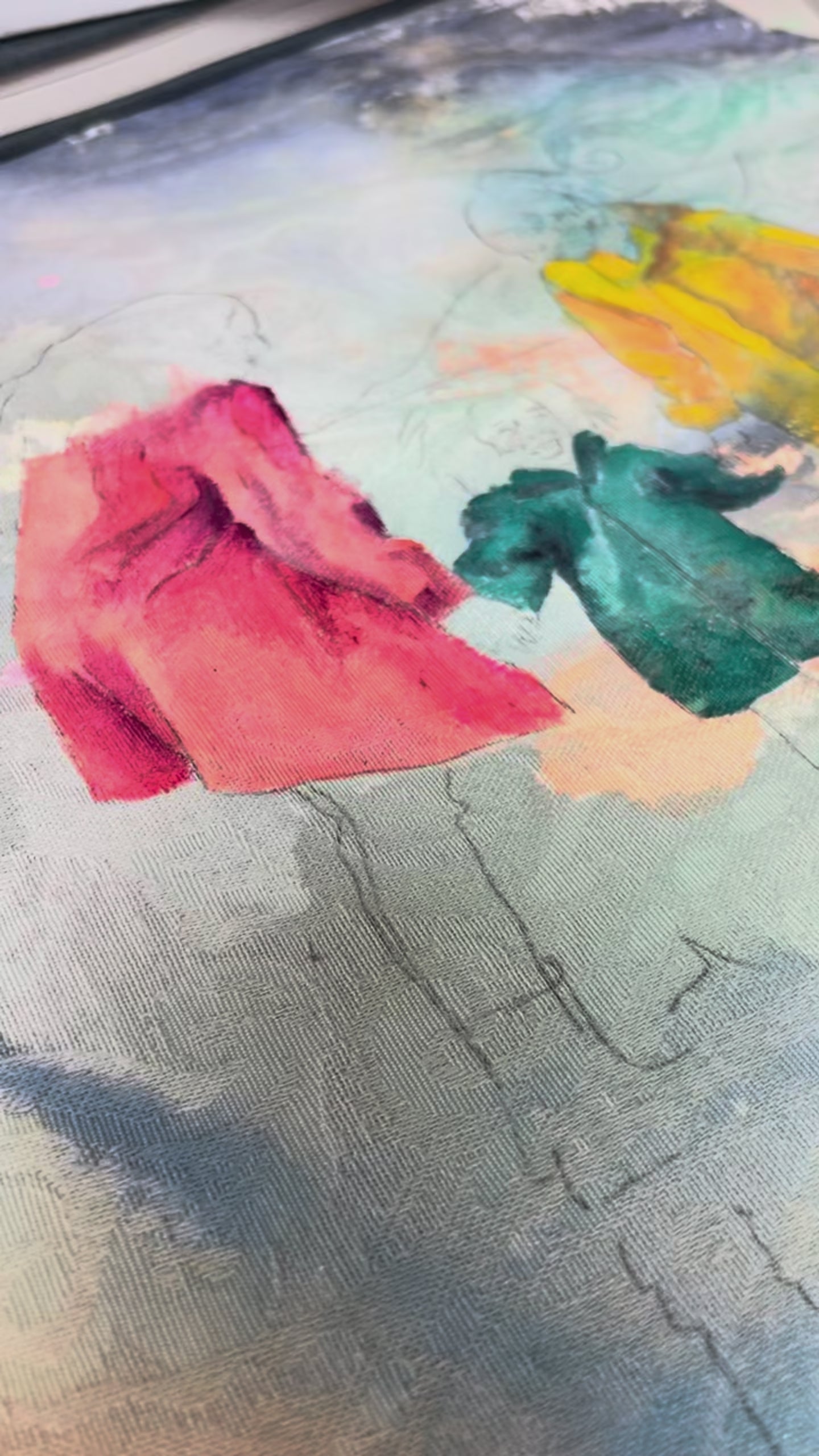 Bildet er malt med akrylmaling og akvarell fra Windsor & Newton, på en gjenbrukt damaskduk, som gir bildet en nydelig struktur. Beskyttet med matt verniss.