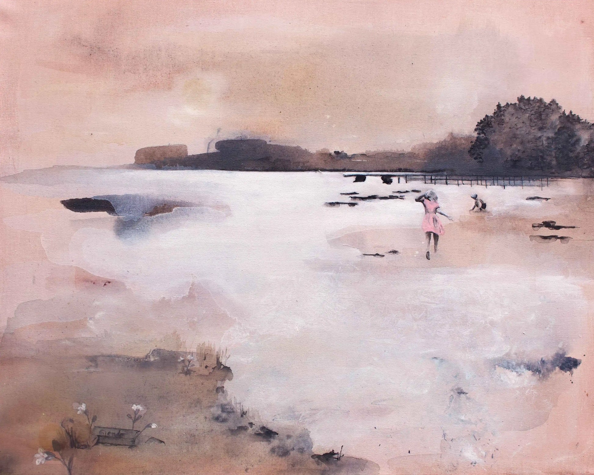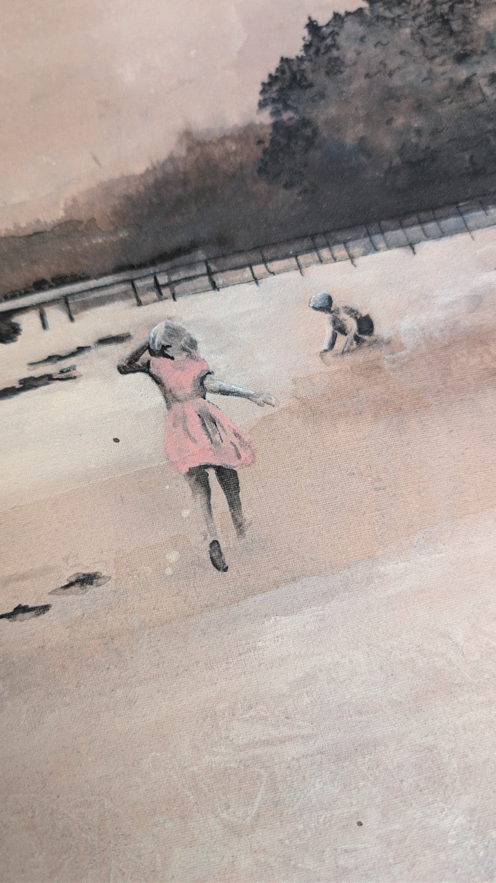 Bildet er malt med akrylmaling og akvarell fra Windsor & Newton, på farget gammelrosa bomullslerret. Beskyttet med matt verniss. Rammet inn i håndmalt skyggeramme i tre. Rammemål: